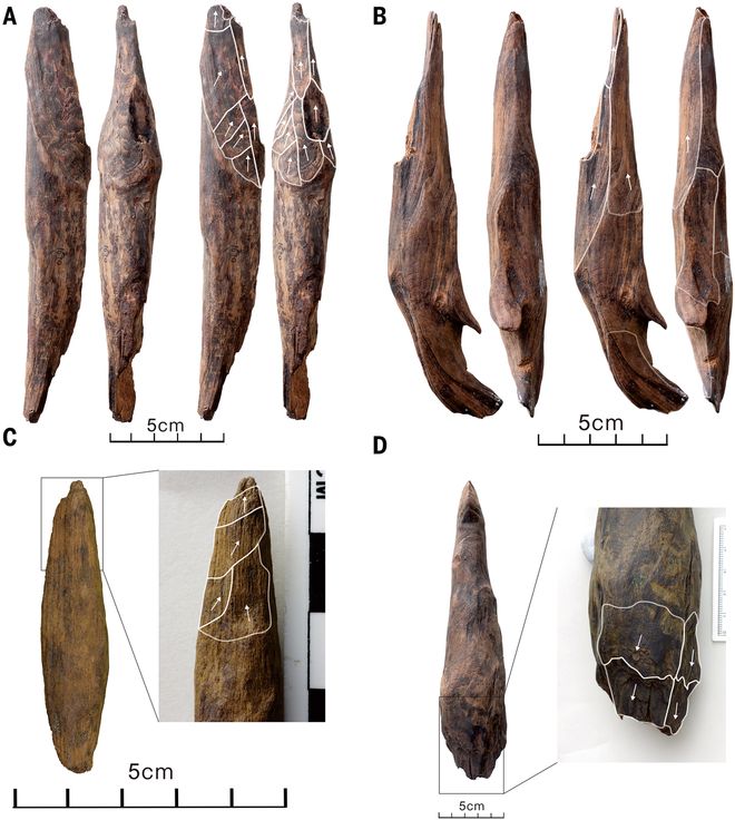 在35件标本中,半数以上保留了磨损与加工痕迹,甚至部分工具尖端附着土壤残留物和植物淀粉粒——这成为它们用于挖掘地下食材的直接证据。模拟实验表明,这些痕迹需要长期使用和刻意加工才能形成。由此可知,这些木器绝非临时捡拾的树枝,而是古人类精心制作、长期使用的“专业工具”。